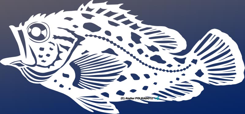 カサゴの色彩、斑点模様は個体差が激しいので、実際に入手した個体をベースに数は減らしてくり抜き描写しました。